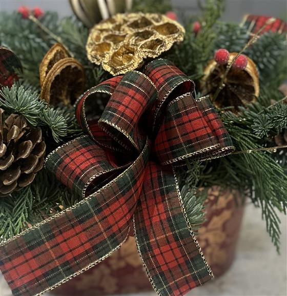 Oval festive metal container arrangement of mixed winter foliages and seasonal accessories. This is designed to be long lasting and will give pleasure through the Christmas season.