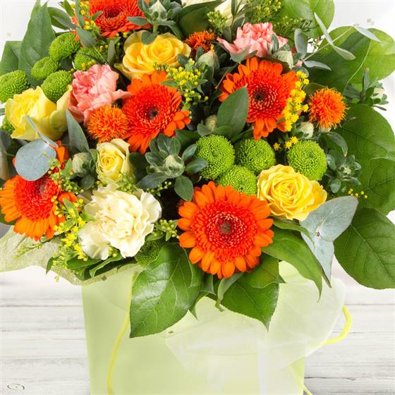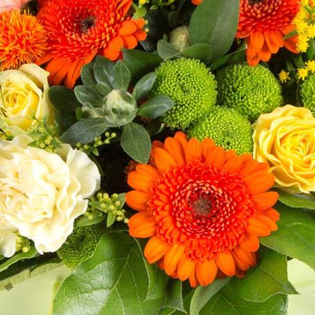 Gerberas, roses, carnations, carthamus and solidaster combine to make an array of colour.